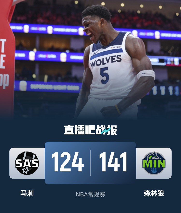 比赛开始,马刺开场慢热,麦克丹尼尔斯帮助球队打出不错开局,福克斯和瓦塞尔内外线接连止血回应,爱德华兹接连三分命中单节上双,森林狼首节领先8分,次节双方展开对攻战,康利连续三分命中,卡斯尔接连突破回应,里德和福克斯也在外线对飚,双方次节打成31平。下半场,双方继续对攻,马刺多点开花追分,爱德华兹接连突破回应,分差始终保持在10分左右,末段森林狼连续3记三分拉开15分领先,末节森林狼继续发力,戈贝尔接连内线吃饼拉开20分以上领先,随后双方逐渐换上替补练兵,最终森林狼141-124击退马刺,拿到5连胜。