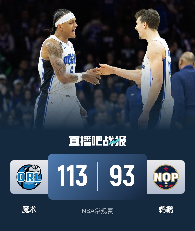 班凯罗34+11 小瓦格纳27+6+5 锡安20+8+5 魔术轻取鹈鹕