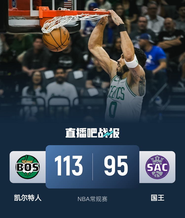 比赛上来,国王就率先发力取得领先,首节的绝大部分时间里凯尔特人都处于落后,但凭借着普理查德的压哨三分他们终于完成反超,次节国王的命中率出现下滑,凯尔特人逐渐占据场上主动,半场结束时国王落后5分;下半场回来,凯尔特人将分差拉开到了两位数,但塔图姆被小萨垫脚返回更衣室,末节凯尔特人一直保持着十分以上的领先优势,国王没有再获得机会,最终凯尔特人轻取国王,迎来六连胜的同时也送给后者三连败。