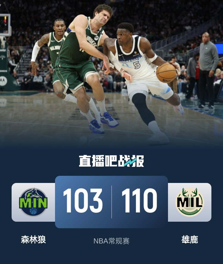 首节开打后爱德华兹早早发力连续取分,雄鹿则多点开花及时回应,首节结束时森林狼领先5分,次节回来,雄鹿一度抹平分差,但森林狼内外结合回敬12-0攻击波,半场战罢,森林狼确立11分优势。短暂休整后字母哥连投带罚率队追分,但迪文岑佐手感滚烫连中三分,爱德华兹延续状态独得11分,三节结束后森林狼已经领先20分,末节上来,场上形势风云突变,雄鹿轰出34-3进攻高潮一举反超,决胜时刻森林狼追分未果,最终雄鹿110-103逆转对手。