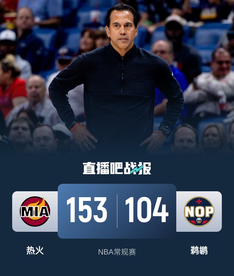 一开场,热火反客为主打出13-4的开局,鹈鹕冲击内线连投带罚努力追赶,热火多点开花保持领先,双方大打对攻,热火持续发力完成12-3的攻击波以71-54领先结束上半场。下半场,鹈鹕命中率下降,热火大举进攻,单节轰下39分净胜对手21分,末节更是将优势扩大到40分以上,鹈鹕大势已去无力回天,热火一度将分差拉开到50分以上。最终,热火153-104狂胜鹈鹕49分。