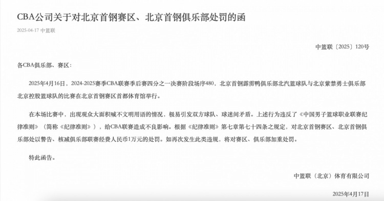 在本场比赛中,出现观众大面积喊不文明用语的情况,极易引发双方球队、球迷间矛盾。上述行为违反了《中国男子篮球职业联赛纪律准则》(简称《纪律准则》),给CBA联赛造成不良影响。根据《纪律准则》第七章第七十四条之规定,对北京首钢赛区、北京首钢俱乐部处以警告、核减俱乐部联赛经费人民币1万元的处罚。如再次发生此类违规,将对赛区、俱乐部加重处罚。