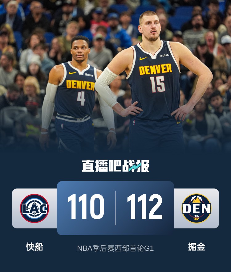 掘金(1-0):约基奇29分9板12助3断、阿隆-戈登25分8板1助2断、穆雷21分9板7助、威斯布鲁克15分8板3助2断、布劳恩11分3板1助2断、沃特森6分2板、波特3分4板、皮克特2分2板