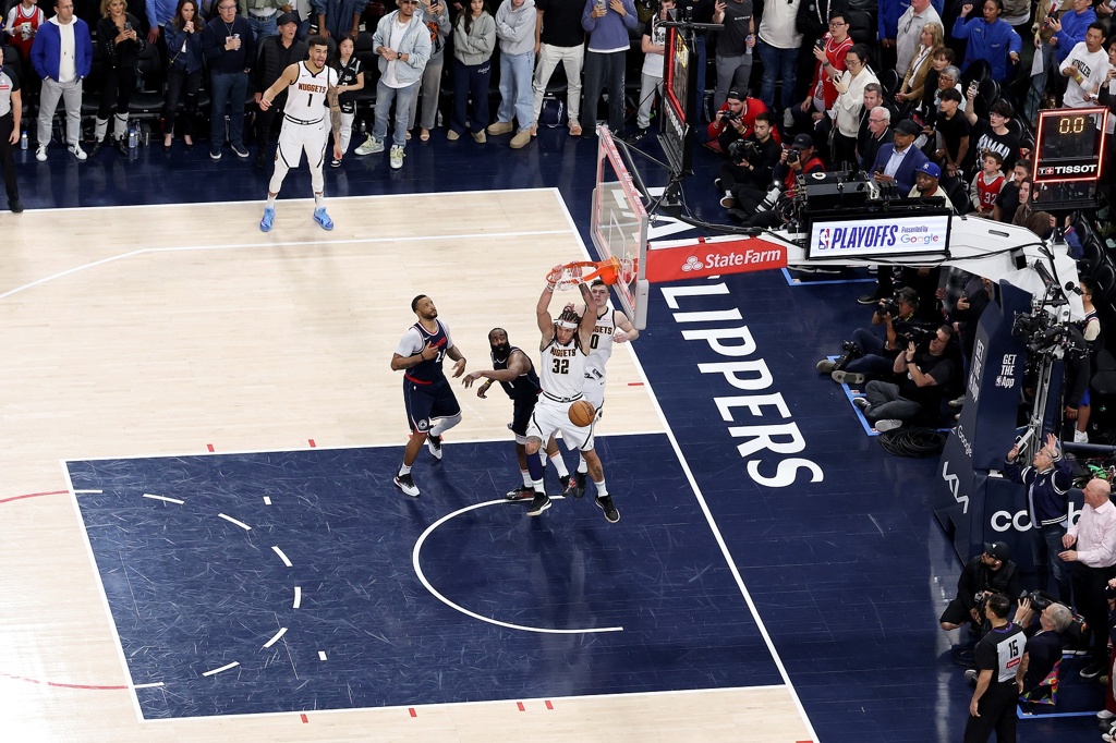 阿隆-戈登以一记NBA季后赛历史上首次压哨扣篮绝杀,改写掘金与快船的首轮系列赛局势后,他立即转身冲向直觉巨蛋球馆的球员通道,右臂高举指向穹顶,宛如橄榄球联盟最顶尖的跑卫。戈登疾速掠过队友贾马尔-穆雷时与之撞胸庆祝,而沃特森试图与其拥抱,却根本无法拦住这位身高2米03、体重107公斤的壮汉。戈登一个转身便冲离球场,奔上通往客队更衣室的斜坡,身后几乎掘金全队都兴奋地追着他那飘扬的脏辫。
