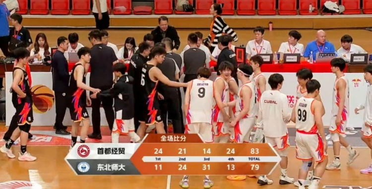 末节开局首都经贸又是符骏和张若宸的连续拿分稳住局面,东北师大则依旧是李春江的稳定拿分稳住局面。但首都经贸这边越战越勇,朱睿泽的2+1和符骏的反击进球一举实现反超。东北师大则迟迟找不到感觉,首都经贸依靠薛海海的三分进一步拉大分差,读秒阶段符骏的进球将优势扩大至7分锁定胜局。最终,首都经济贸易大学83-79逆转东北师范大学拿下比赛。