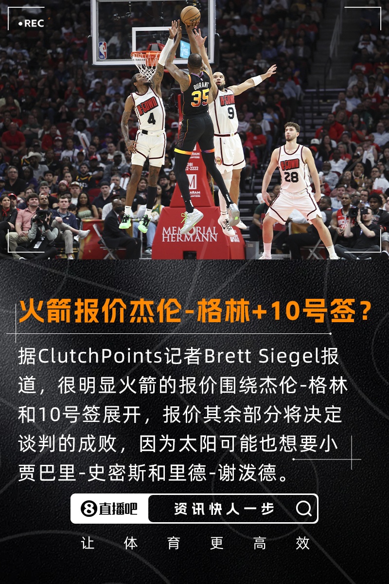 记者:火箭报价KD主体是格林+10号签 太阳可能也想要小贾+谢泼德