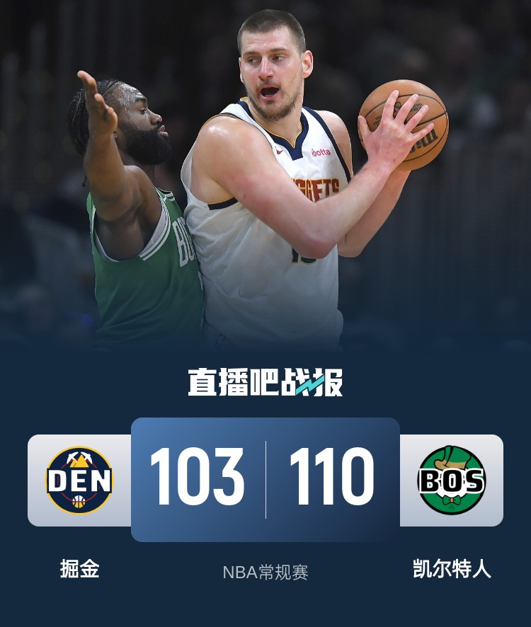 比赛开始,凯尔特人率先发力,多点开花占据场上主动,次节掘金进攻回暖,两队展开对攻,凯尔特人稳扎稳打保持优势,半场战罢凯尔特人61-48领先掘金。下半场,凯尔特人命中率下降,约基奇表现全面带队缩小分差,末节双方展开拉锯战,凯尔特人多点开花保持优势,最终,凯尔特人110-103击败掘金,主场过关。