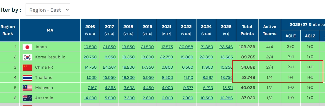 在泰山退赛情况下,目前中超球队在亚冠赛场仅剩海港、申花两队争取技术分。目前中国积分为54.682,身后泰国积53.748分虎视眈眈。一旦中国被泰国超越,那么26/27亚冠精英联赛的名额将缩减为1+1。