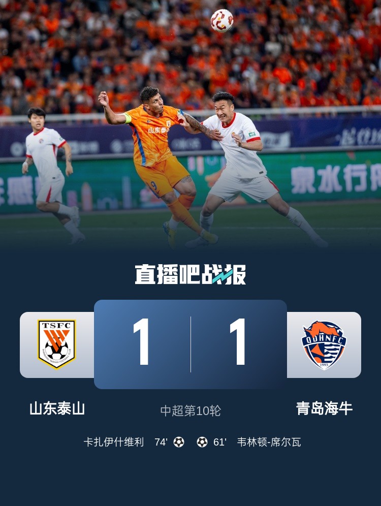 5月1日讯 北京时间5月1日19:35,中超第10轮,山东泰山坐镇济南奥体中心迎战青岛海牛。上半场,刘洋前插抢点制造威胁,金洋洋、冯伯元染黄,王彤大腿拉伤离场。下半场,席尔瓦单骑闯关破门,卡扎伊什维利错失良机后将功补过扳平比分。最终,山东泰山主场1-1战平青岛海牛,遭遇三轮不胜,后者开赛至今4平6负未尝胜绩。