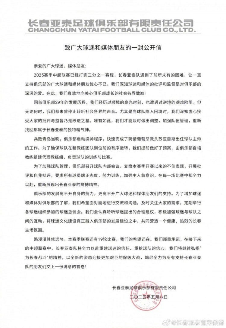 5月8日讯 今天,长春亚泰俱乐部发布了致广大球迷和媒体朋友的一封公开信 。