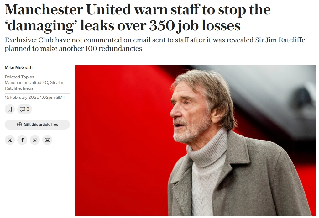 好像没用?电讯报:曼联计划继续裁员,发邮件警告员工别泄密