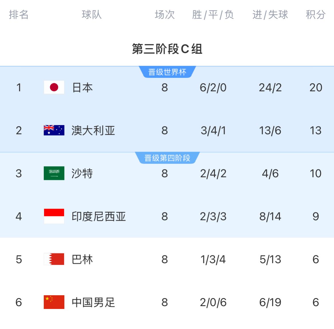 世预赛C组积分榜