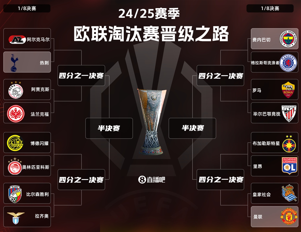 欧联1/8决赛对阵:曼联vs皇社 热刺vs阿尔克马尔 费内巴切vs流浪者