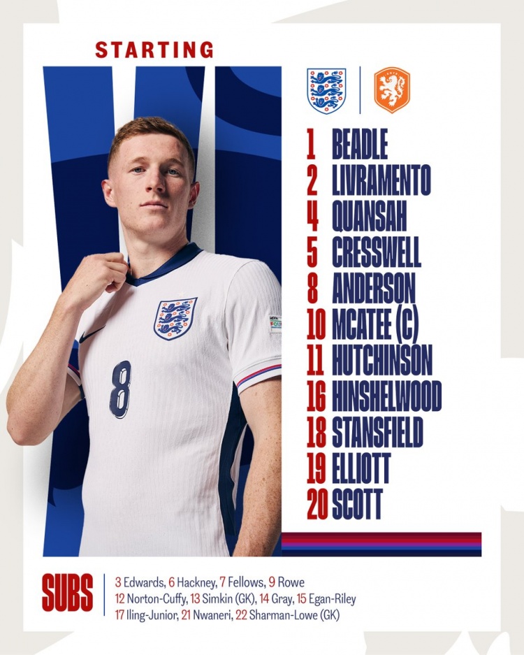 英格兰U21首发:1-比德尔、2-利夫拉门托、4-宽萨、5-克雷斯韦尔、8-埃利奥特-安德森、10-麦卡蒂、11-哈钦森、16-辛谢尔伍德、18-史坦斯费尔德、19-埃利奥特、20-阿莱克斯-斯科特