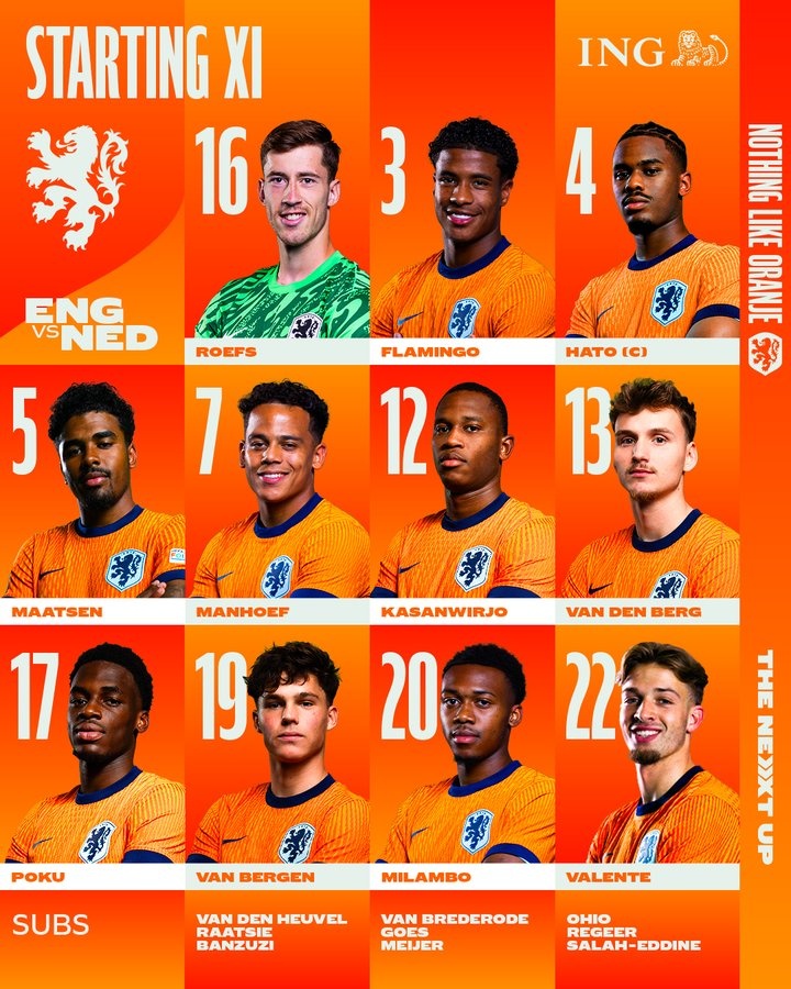 荷兰U21首发:16-罗夫斯、3-弗拉明戈、4-哈托、5-马特森、7-曼霍夫、12-卡桑维约、13-范登伯格、17-波库、19-范伯根、20-米兰博、22-瓦伦特