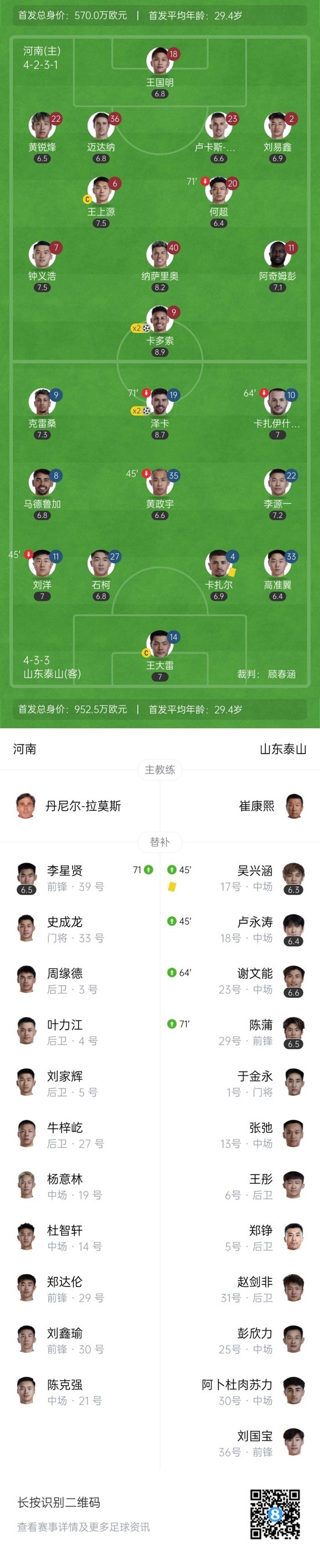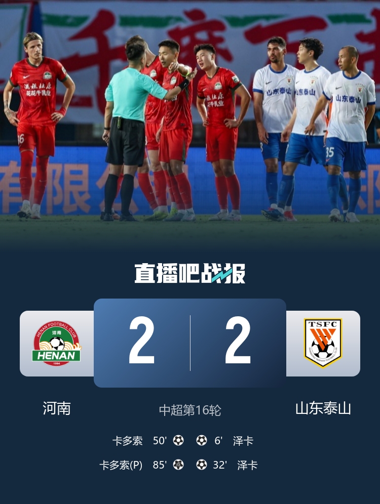 连追2球!河南轰27脚2-2泰山 卡多索泽卡双响彭欣力登场2分钟染红