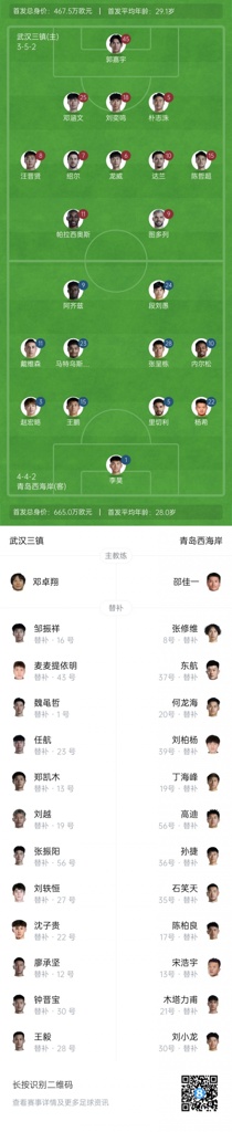 07月18日讯 今晚19:00中超第17轮,武汉三镇主场迎战青岛西海岸。赛前首发阵容已经公布。