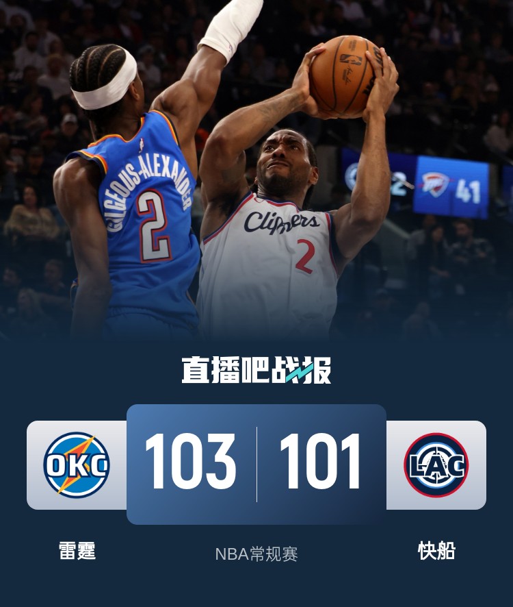 比赛上来,两队就打得十分胶着,场上比分交替领先,但首节末段雷霆的进攻遇到麻烦,快船抓住机会将分差拉开到两位数,次节场上局势再变,雷霆在四分多钟的时间里打出15-2的攻势完成反超,这一节快船只有17分,半场结束时雷霆领先6分;下半场回来,两队保持拉锯,快船虽有追平但始终无法反超比分,末节双方一直将悬念保持到了最后,关键时刻鲍威尔三分不中,但祖巴茨拿到前场板,莱昂纳德长两分再铁,亚历山大两罚全中,最终雷霆险胜快船,迎来六连胜的同时也终结了后者的五连胜。