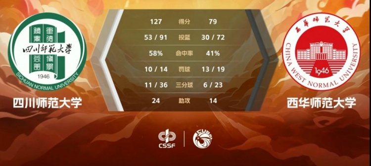 末节比赛,四川师大依旧火力不减,多点开花牢牢占据场上主动,栾婷婷追身三分命中,陈嘉怡反击再中将分差拉开到40分以上,西华师大无力招架,双方替补阵容的较量四川师大仍不落下风,栾婷婷连续拿分一度将优势扩大到50分以上,最终,四川师大127-79大胜西华师大。