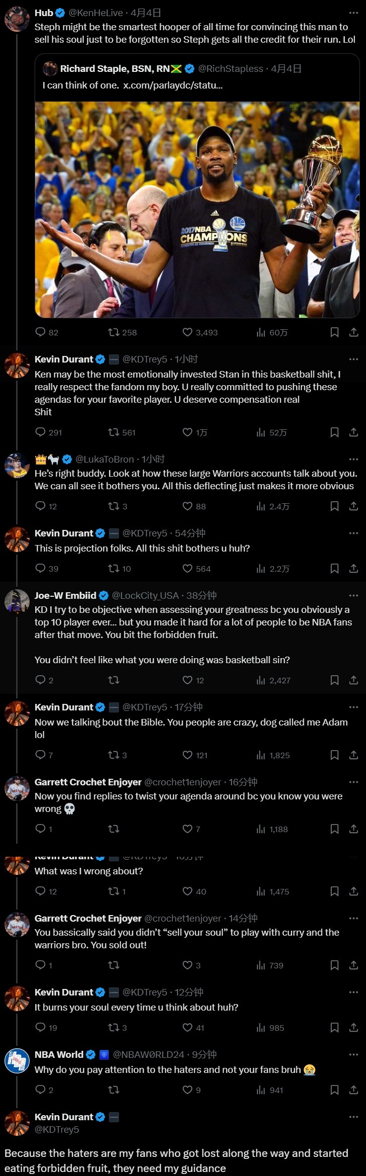 网友Joe-W Embild:KD,我会尽量去客观评价你的伟大之处,因为显然你是历史前十的球员,但自从那次转会后,很多人都不是NBA球迷了,你偷吃了禁果。你不觉得自己做的事情是篮球的罪过吗?