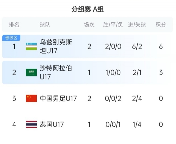 积分榜方面,乌兹别克斯坦提前晋级,而中国男足U17仅剩理论上的可能。