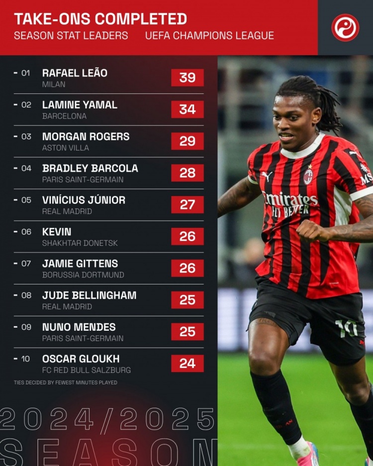 本赛季欧冠过人王前十榜单:莱奥39次居首,亚马尔34次排名第二