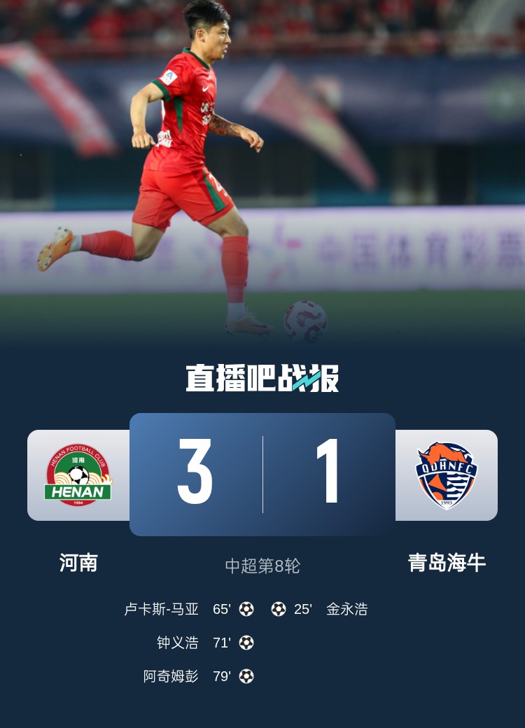 4月20日讯 北京时间4月20日18:30,中超联赛第8轮河南迎战青岛海牛的比赛在郑州航海体育场进行,上半场宋文杰助攻金永浩头球首开记录,阿奇姆彭抽射造险,河南0射正,半场结束,河南0-1青岛海牛。下半场迈达纳助攻马亚扫射扳平比分,钟义浩低射破门反超,阿奇姆彭推射扩大比分,最终河南3-1逆转青岛海牛,河南积7分暂升第12,海牛开局2平6负积2分未尝一胜垫底。