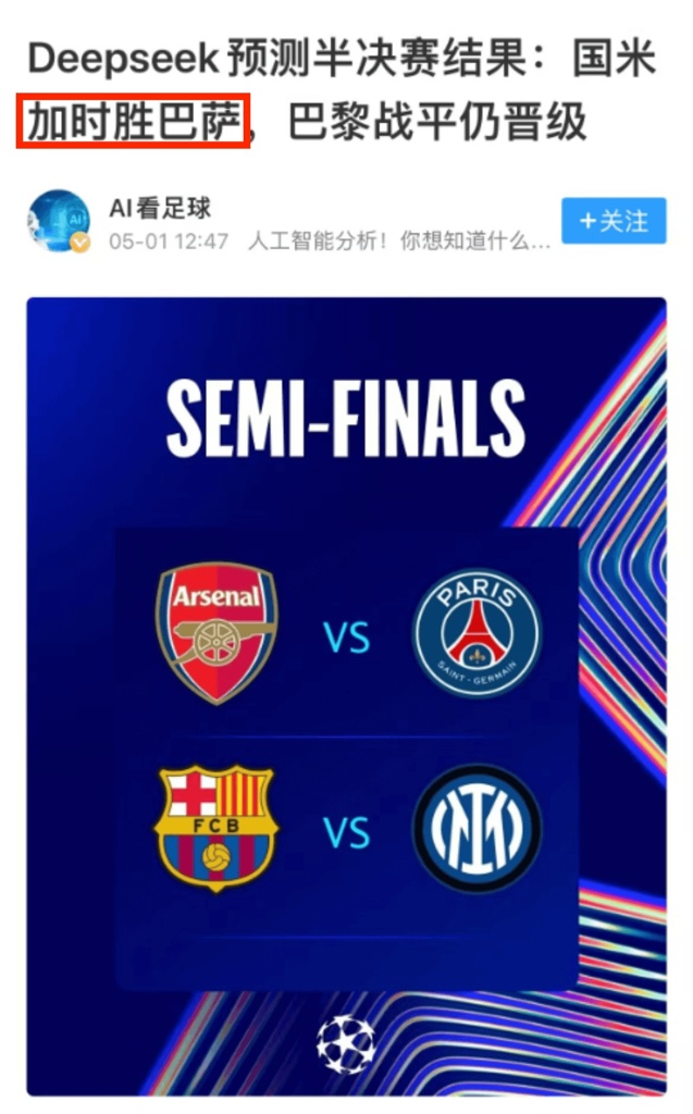 对于下一场半决赛,Deepseek预测巴黎战平阿森纳,但仍会晋级。