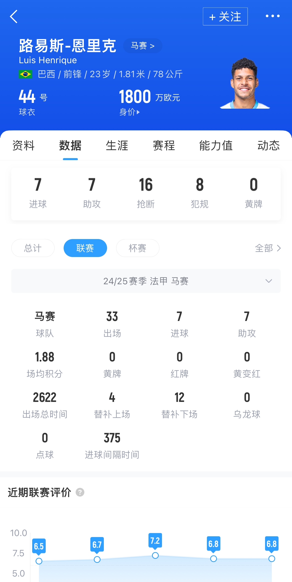 路易斯-恩里克现年23岁,巴西边锋,本赛季联赛代表马赛在法甲出场33次,贡献7球7助。目前球员德转身价为1800万欧元。