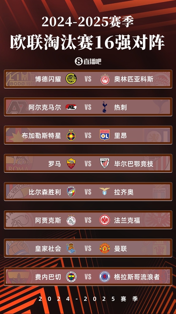 欧联1/8决赛对阵:曼联vs皇社 热刺vs阿尔克马尔 费内巴切vs流浪者