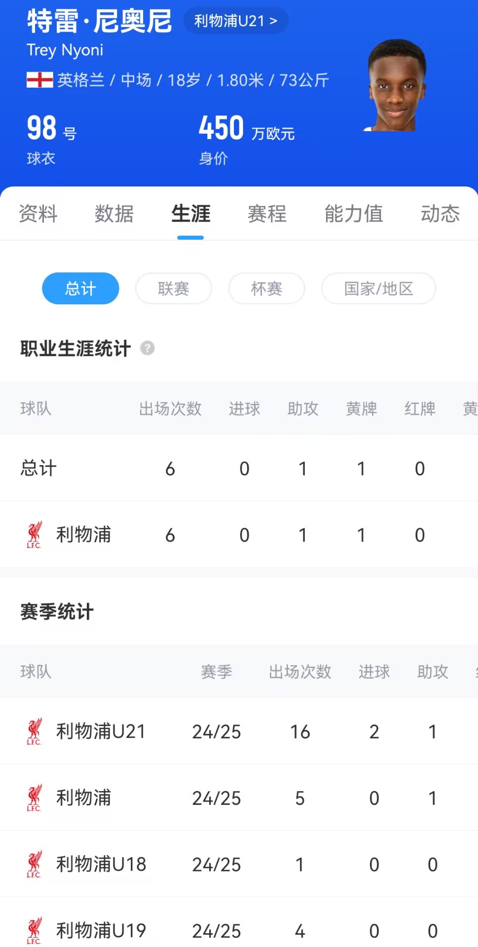 在对阵埃因霍温的欧冠比赛中,尼奥尼以17岁零213天的年龄替补出场,成为利物浦在欧战中最年轻的出场球员。
